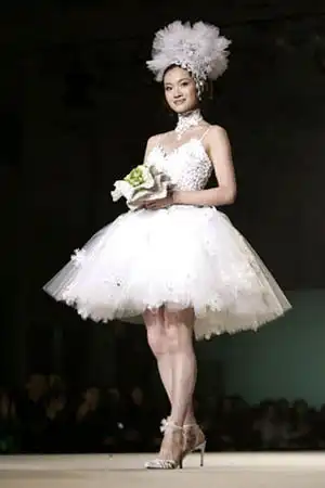 Платье «подешевле» (за восемь миллионов долларов) вышло из-под руки дизайнера Юми Кацуры. Платье из изысканного шелка и атласа расшито тысячей жемчужин, а главным украшением наряда стали два редких бриллианта: зеленый (8,8 карат) и золотистый (5 карат).