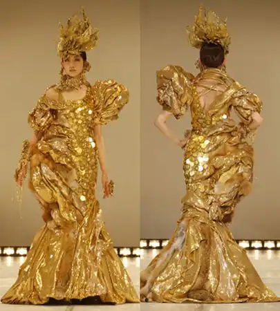 Ювелир Гинза Танака создал длинное вечернее платье, сделанное из тончайшей, очень мягкой и прочной золотой проволоки. Стоимость наряда составила 250 тысяч долларов, а вес - более килограмма