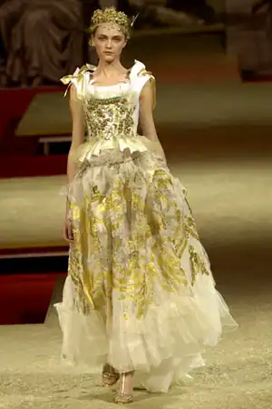 Может быть, Модный дом Christian Lacroix потому и заявил о своем банкротстве, что его наряды стоят немыслимых денег? Например, вечернее платье из эксклюзивного кремового шифона и принтами из золота за 150 тысяч долларов. Модель, представившая платье, вышла на подиум еще и в золотой короне, декорированной жемчугом.