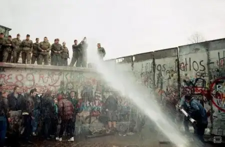 11. Пограничная служба Восточной Германии использует шланг, чтобы разогнать жителей Западного Берлина недалеко от Бранденбургских ворот в берлине 11 ноября 1989 года. Жители западной части пытались снести стену. (Lionel Cironneau, AP)