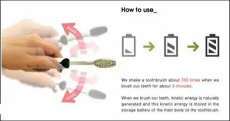 Когда человек чистит зубы, он трясет зубной щеткой снизу-вверх, из стороны в сторону. А специальный генератор, встроенный в корпус щетки, преобразует эту кинетическую энергию в электрическую. Для полной зарядки батареи этого необычного устройства необходимо активно чистить зубы около трех минут. Столько и должен в идеале длиться этот процесс.