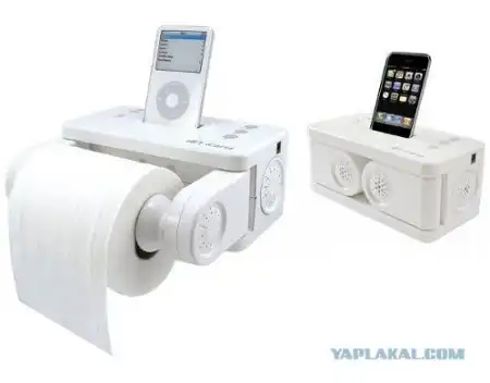 8) Некоторым людям в уборной порой становится скучно, поэтому газеты и журналы с анализом последних событий мирового значения – привычный атрибут многих подобных помещений. Но печатная продукция может угодить далеко не всем, и компания Atech предлагает дополнить её высокими технологиями, а именно док-станцией iCarta для iPod, одновременно выполняющей функцию держателя туалетной бумаги. Стереосистема управляется расположенными на корпусе устройства кнопками, а четыре динамика имеют защиту против влаги. После установки плеера в разъём осуществляется подзарядка. Стоимость iCarta - $60.