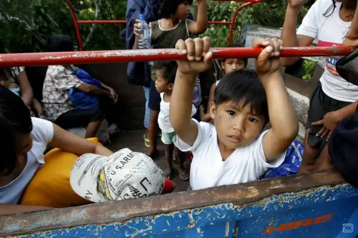 Филиппинский мальчик рядом с другими сельскими жителями в военном грузовике, во время эвакуации из пятимильной зоны опасности вокруг вулкана Майон 15 декабря. (Dennis M. Sabangan / EPA)