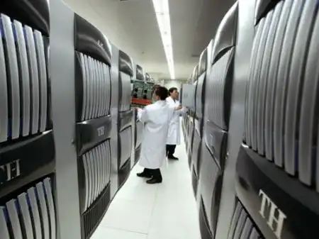 Имея однажды звание второго по быстродействию компьютера в мире, Jugene в Юлихском суперкомпьютерном центре (Jülich Supercomputing Centre), Германия, базируется на архитектуре IBM Blue Gene/P, в которой используется множество энергоэффективных чипов. Максимальная тактовая частота каждого процессора PowerPC 450 не превышает 850 МГц, что заметно меньше мощности CPU домашней системы. Однако Jugene "берёт" количеством: 294912 чипов с производительностью 3,4 Гфлопс каждый делают эту машину самой быстродействующей в Европе. Снимок сделан во время обновления ранее в этом году. Модификация должна позволить преодолеть отметку в 1 Пфлопс, текущее значение – 825,5 Тфлопс. Система со 144 Тб памяти и 6 Пб дискового пространства управляется операционной системой CNK/SLES (SuSE Linux Enterprise) 9. Аппаратное обеспечение располагается в 72 стойках с 32 картами в каждой. В свою очередь, на карте расположены 32 узла с 2 Гб памяти. Максимальное энергопотребление достигает 35 кВт на одну стойку.