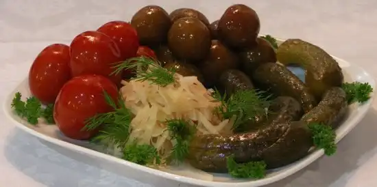 Приготовление: Вареные свеклу, картофель, морковь, а также огурец нарезать на мелкие кубики. Лук и зелень мелко нашинковать. Измельченные овощи соединить с квашеной капустой, вареной фасолью и заправить растительным маслом.