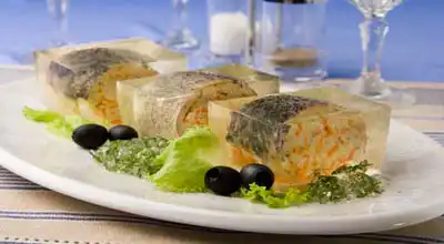 Ингредиенты: примерно 2 кг судака или трески, лук репчатый 2 шт., морковь 1 – 2 шт., корень петрушки, 1 пучок зелени, желатин (40 г на 1 литр бульона).
