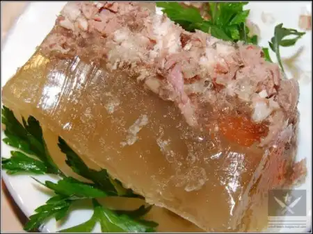 Ингредиенты: 1 кг свиных или телячьих ног, 300 г голени телятины, 1 луковица, 3 моркови, 3 лавровых листа, 5 горошин перца, 2 стебля сельдерея, 2 зубчика чеснока, вода, соль, рубленая петрушка, 1/3 cтакан уксуса.