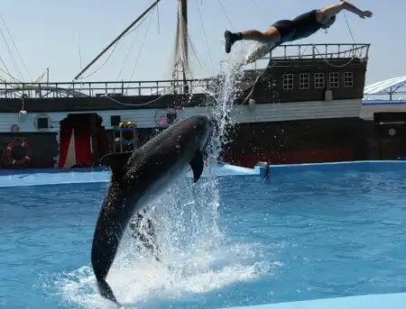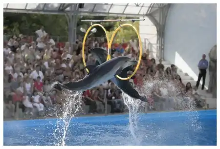 Цирковые выступления дельфинов демонстрируются во многих океанариумах и дельфинариумах, вызывая большой восторг публики. Дельфины прыгают в заклеенные бумагой или горящие обручи, играют в футбол, передвигаются на хвосте, катают на спине всадника, «поют» перед микрофоном, звонят в колокол и т. д.