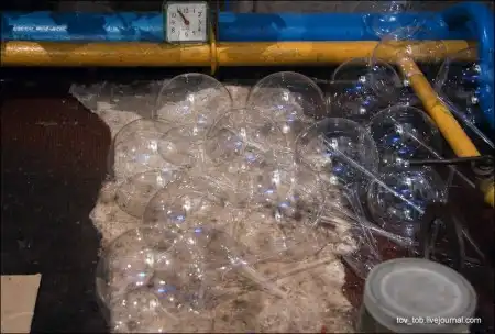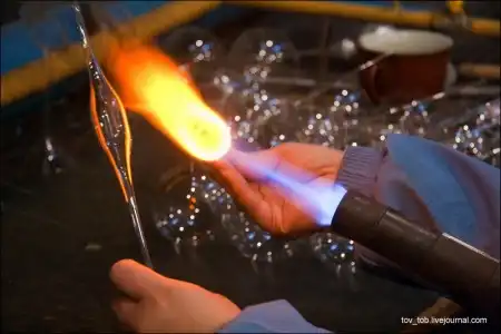Первый этап производства украшений - выдувка из стеклотрубки высотой примерно 1,5 м шарика или другого украшения. Для разных украшений используется стеклотрубка своего диаметра и со своей толщиной стенок.