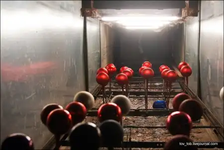 Выкрашенные шары отправляют в печь - здесь они высыхают под лампами. Реостатом регулируется напряжение, подаваемое на лампы, и, соответственно, температура: