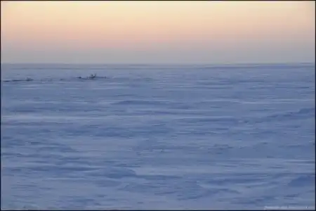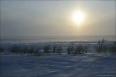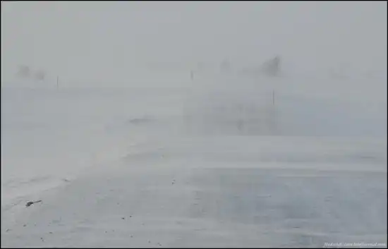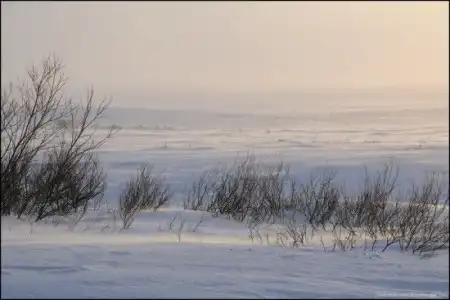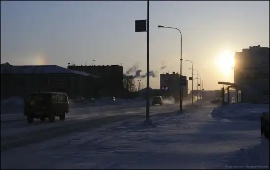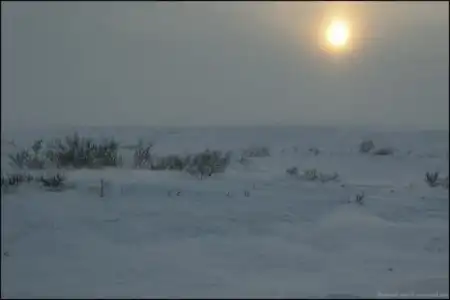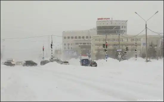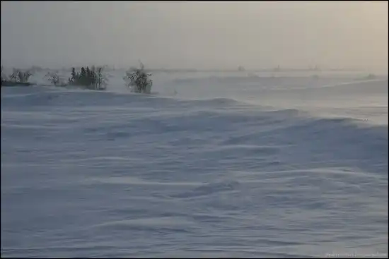 6) Мы в Усинске (ударение на "у"). Правда, нам сказали, что в Нарьян-Мар мы, конечно, не доедем: нужна тачила посерьёзнее - ну, это нам уже говорили перед дорогой на Нижмозеро, которую, мы, кстати, вполне прошли. Короче, было решено доехать до начала НМ зимника и, хотя бы, посмотреть, что это такое. Заодно пересечь Полярный Круг. Тем более, что туда асфальтовая дорога. Итак, за окном снова -20, вот только... раньше я думал что поговорка "если ворона летит хвостом вперёд - на улице сильный ветер" - это шутка.
