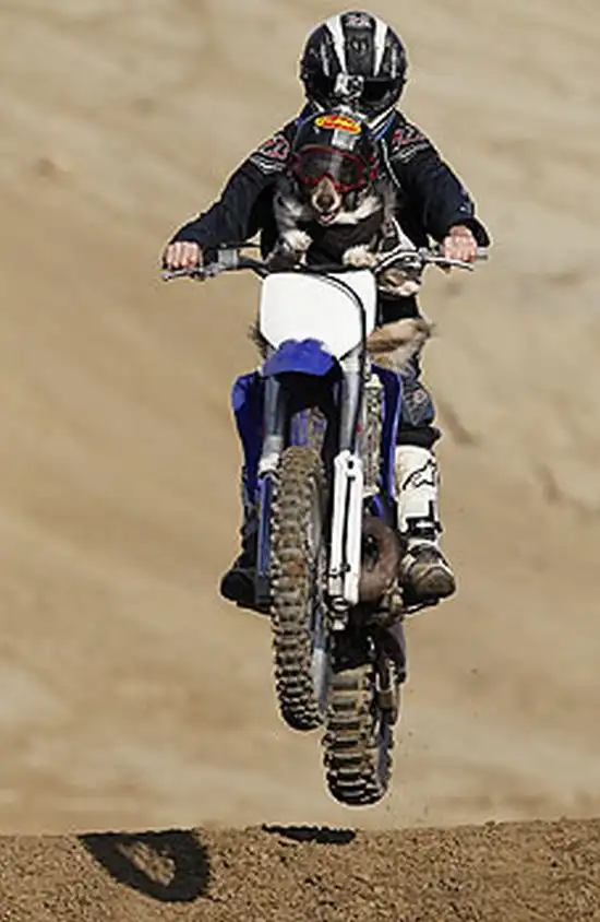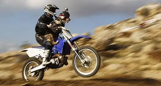 Смелый пес, настоящий экстремал))Не боится кататься на байке на высоких скоростях.