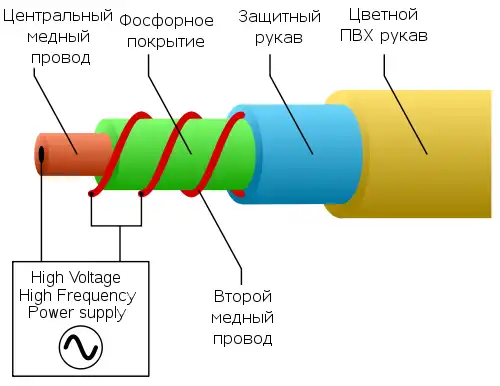 Технологически гибкий неон представляет собой 2-проводный цилиндрический конденсатор, заключенный в прозрачную пластиковую оболочку.