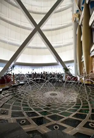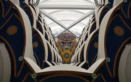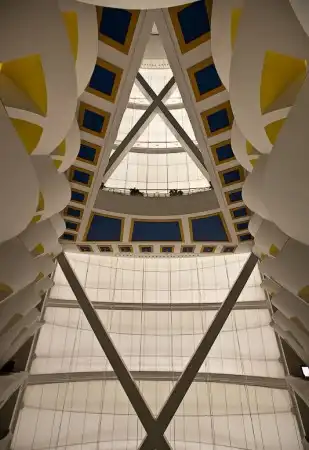 В Бурдж Аль Арабе самое высокое в мире гостиничное лобби - 180 метров. Сама гостиница треугольная, и белая сторона, которая обычно видна снаружи, изнутри действительно выглядит как натянутый парус: