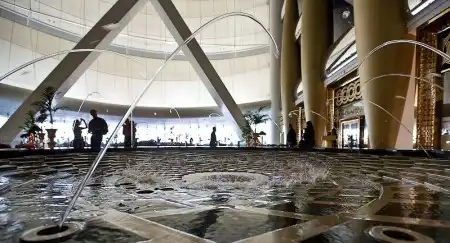Войдя в гостиницу, Вы упретесь в лестничный фонтан с двумя эскалаторами по бокам. Фонтан периодически начинает играть, плюясь короткими струйками воды: