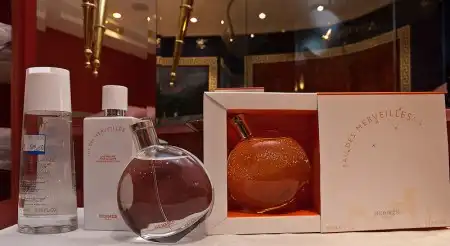 Ванная "инкрустирована" полноразмерной косметикой от Гермес. Мужская линия с черными крышечками, а женская с белыми. Дворецкий сказал, что мы можем забрать всю косметику с собой, что мы и сделали. Так же он "разрешил" стырить тапочки и великолепную пляжную сумку: