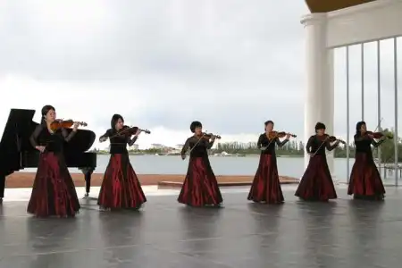 Огромный концертный зал с потрясающей акустикой таит в себе еще одну загадку - уникальная сцена, плавно переходящая в зеркальную гладь чистейшего озера Иссык-куль.