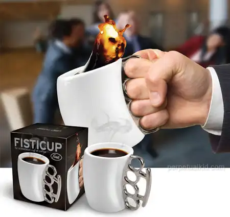 Эта кружка имеет миниатюрный винт на батарейках на дне, который вращается со скоростью в 3000 оборота при нажатии кнопки на рукоятке, автоматически перемешивая ваш напиток.
