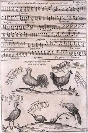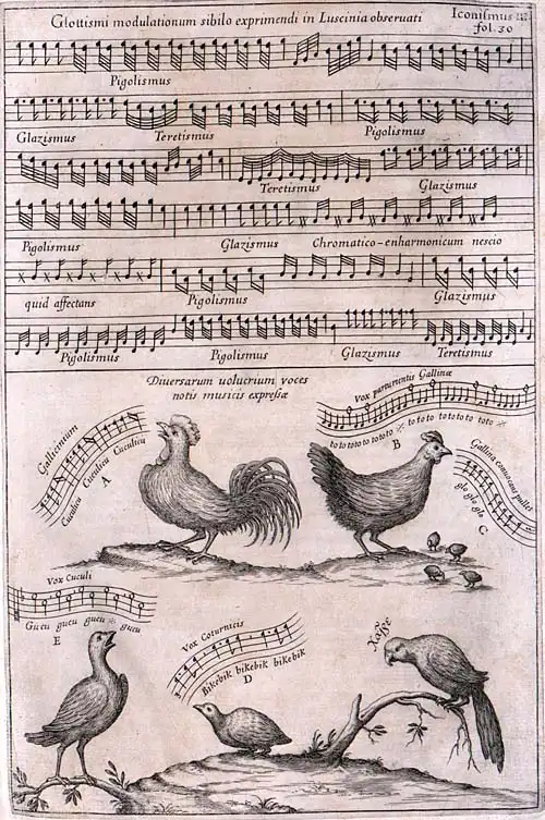 Построил специальную машину, с помощью которой можно получить нотную запись песен птиц. Привел нотную запись голосов курицы, петуха, кукушки и перепела. Разбирал влияние музыки на человека в зависимости от его темперамента.