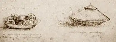 5. На случай морского сражения, у меня есть чертежи для постройки всяческих хитроумных приспособлений, которые наилучшим образом годятся как для нападения, так и для обороны, а также судов, которые способны устоять перед огнем мощнейших орудий, ибо оные не боятся ни пороха, ни дыма.