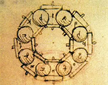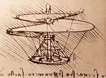 Вертолет Леонардо. С винтом из тонкого льна, пропитанного крахмалом диаметром 5 метров. Он должен был приводиться в движение четырьмя людьми, вращающими рычаги по кругу (разумеется такой мощности было бы недостаточно и, кроме того, даже в случае подъема эта конструкция стала бы вращаться вокруг своей оси