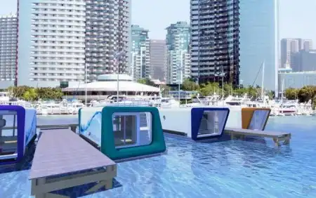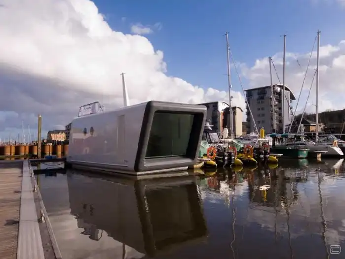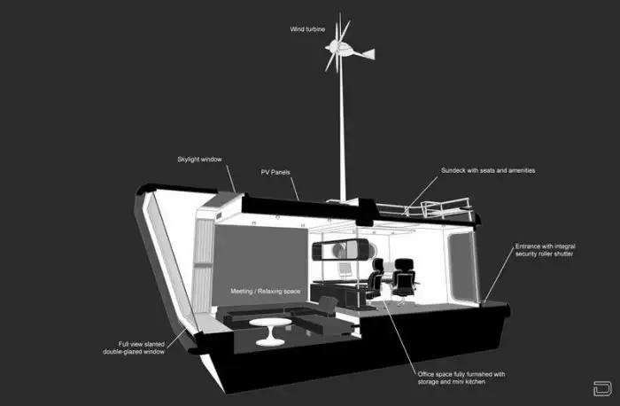 Это плавающее устройство изначально задумывалось как плавающий офис, но вы можете настроить его как угодно, он также может быть использован для других целей: номер в гостинице, складские помещения ...