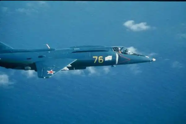 Краткая биография: Появился на свет силами конструкторского бюро Яковлева в 1981 году. К тому времени британцы смастерили вполне успешный самолет вертикального взлета и посадки Harrier, Стране Советов нужно было как-то ответить на этот наглый вызов западной военщины. Тем более что как раз были построены первые советские авианесущие крейсеры (опять-таки, в ответ на североатлантические корабли такого класса), а оснащать их было нечем, кроме довольно вертолетов, которые не могли решать все боевые задачи на море.