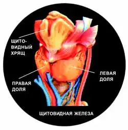 Щитовидная железа - одна из самых крупных желез внутренней секреции: у взрослого человека она весит 15-20 г и состоит из двух долей длиной 4 см и шириной 2-2,5 см, соединенных перешейком. Своим наименованием она обязана анатомической близости к хрящу гортани, который очертаниями напоминает щит. Иногда щитовидная железа может располагаться не за хрящом, а, например, в корне языка или за грудиной. У некоторых людей она отсутствует совсем. Если раньше младенцы, родившиеся без щитовидной железы, были обречены, то сейчас синтетические гормональные препараты полностью компенсируют отсутствие в крови естественных тиреоидных гормонов.