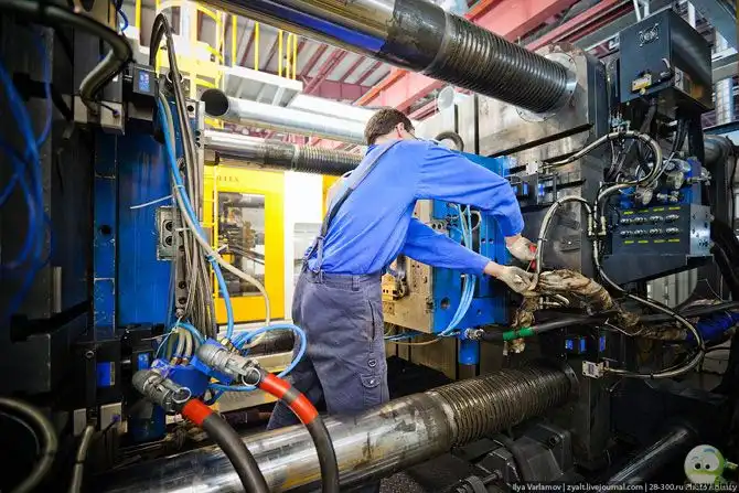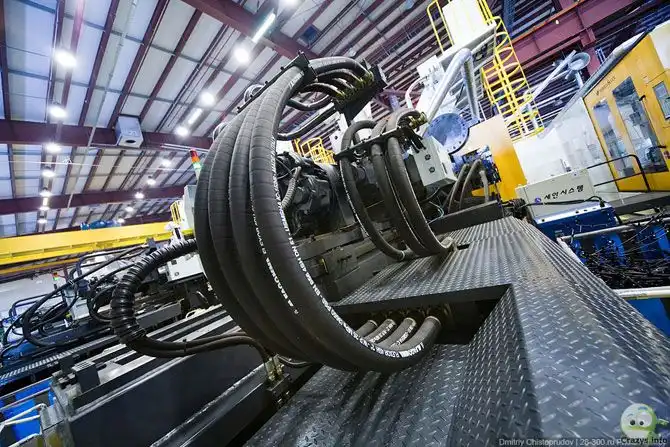 6. А вот станки в которые устанавливаются пресс-формы. Сюда под давлением поступает горячая пластмасса, под давлением ее закачивают в пресс-форму и получается деталь