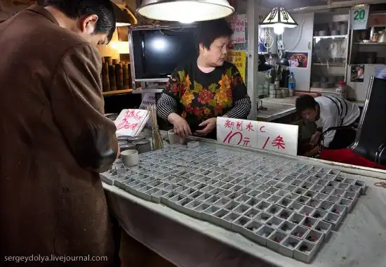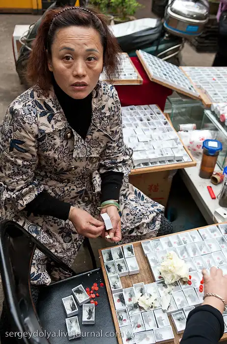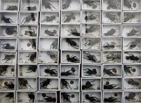 В Шанхае Сергей Доля побывал на местном "Птичий рынок". Здесь продают утят, кроликов, мышей, птиц, рыбок, лягушек, черепах и много еще кого. Больше всего меня удивили насекомые. Я впервые видел их в таком количестве. Интересно наблюдать процесс выбора таракана для будущих боев. А еще тут много "певчих" насекомых…