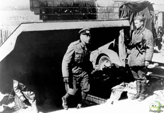 — Я здесь был, это и есть вход в рейхсканцелярию. Я спускался вниз, но недалеко, было противно — там много трупов лежало. Вот здесь, как войдешь, — справа, трупы Геббельса, его жены Магды и их детей. Родители их отравили. Труп Гитлера тоже видел, он лежал дальше, метрах в 50, он и Ева Браун, обугленные, рядом собака.