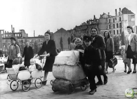 — Это беженцы немецкие домой возвращаются. Видите, вылезают из укрытия в подвалах, им сказали, наверное, что где-то кухня есть, накормят. Наши солдаты сердобольные…