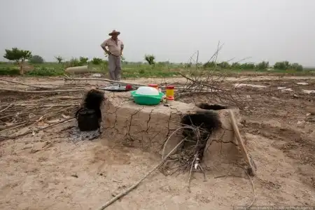8. Следующую остановку мы сделали в поле, где дружная семья сажала арбузы и дыни. Мы приехали как раз к обеду.