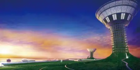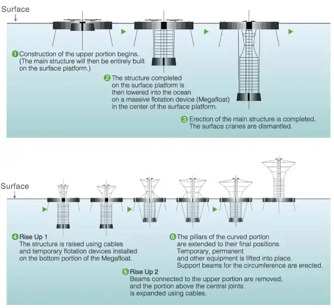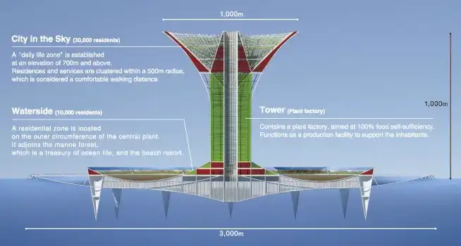Высота сооружения, как предполагается, составит 1 км, основание будет иметь диаметр 3 км. В городе будет предусмотрена вся необходимая для жизни инфраструктура. Здесь будут располагаться жилые комплексы, системы по переработке отходов, агрофермы и т.д. Конструктивные элемента города будут, во многом, состоять из магниевого сплава, при чем магний планируется получать из морской воды. Башни будут иметь защиту от волн. Для этих целей по периметру будет сооружен вал высотой 20-30 м.