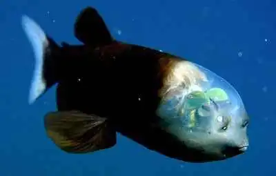 Факт: заметьте, что две маленьких дырочки спереди головы бочкоглазой рыбы — не глаза, настоящие глаза находятся внутри головы (зеленоватые купола).