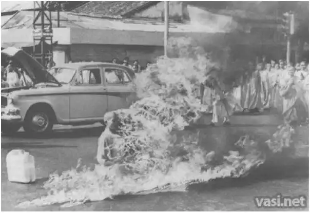 4. Малкольму Брауну, 30-летнему фотографу (Ассошиэйтед Пресс) из Нью Йорка,позвонили по телефону и попросили быть на определенном перекрестке в Сайгоне следующим утром, т.к. должно произойти что-то очень важное. Он приехал туда с репортёром из Нью-Йорк Таймс. вскоре подъехала машина, из неё вышли несколько буддийских монахов. Среди них - Thich Quang Duc, который сел в позу лотоса с коробкой спичек в руках, тогда как остальные стали поливать его газолином. Thich Quang Duc чиркнул спичкой и превратился в живой факел. В отличие от плачущей толпы, видящей как он горит, он не произнес ни звука и не пошевелился. Thich Quang Duc написал тогдашнему главе вьетнамского правительства письмо с просьбой прекратить репрессии в отношении буддистов, прекратить задержания монахов и предоставить им право исповедовать и распространять свою религию, но не получил ответа.