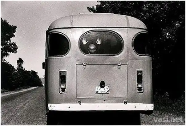 32. Молодой мальчик выглядывает из автобуса, загруженного беженцами, которые сбежали из эпицентра войны между чеченскими сепаратистами и русскими, рядом с Шали, Чечня. Автобус возвращается в Грозный. Май 1995. Чечня.