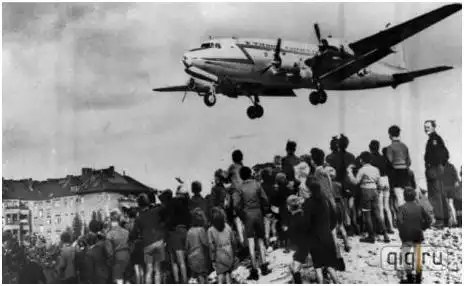 38. Американские военные самолёты сбрасывают берлинцам продукты, прорывая блокаду, установленную советской военной администрацией, 1948 год.