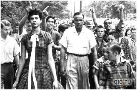 39. Первый день Дороти Коунтс в средней школе Гарри Хардинга, штат Северная Каролина, США, 4 сентября 1957 года. Дороти была одним из первых черных школьников, которым разрешили учиться в школе. Однако девочка не выдержала и 4 дней из-за гонений в школе.