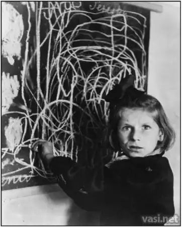 12. Польша - девочка Тереза, выросшая в концентрационном лагере, рисует "дом" на доске. 1948