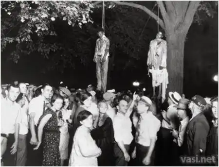 18. Суд Линча (1930) Lawrence Beitler. Этот кадр был сделан в 1930, когда толпа из 10 тысяч белых повесила двух чернокожих мужчин за изнасилование белой женщины и убийство её молодого человека. Толпа «освободила» преступников из тюрьмы, чтобы линчевать. Поразительный контраст – радостные лица людей как фон для растерзанных трупов.