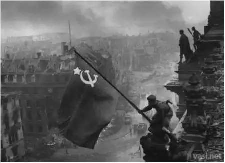 28. Фотография, на которой было запечатлено водружение Знамени Победы над Рейхстагом облетела весь мир. Евгений Халдей, 1945 год.