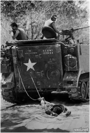 31. Американские военные волокут на привязи тело вьетконговского (южновьетнамский повстанец) солдата. 24 февраля 1966 года, Тан Бин (Tan Binh), южный Вьетнам.