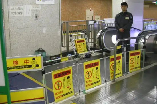 Специальный сотрудник метрополитена следит, чтобы никто не забрел на ремонтируемый эскалатор.