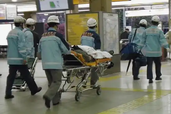Вот человеку стало плохо в метро, его вывозят шестеро медиков в полной экипировке.