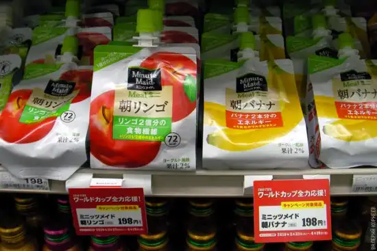 Охлажденное желе в пакетиках с соской иногда доползает до «Азбуки вкуса», но вообще в России его днем с огнем и по нормальным ценам не сыщешь (Rich в похожей упаковке выпускает фруктовое пюре, это другое). Minute Maid с кусочками фруктов, другие производители добавляют витамины и «энергетические» компоненты.
