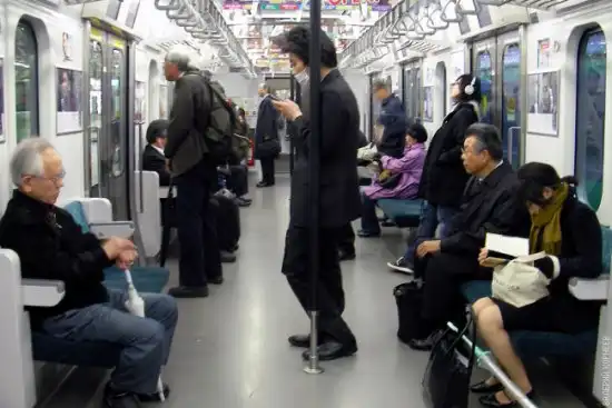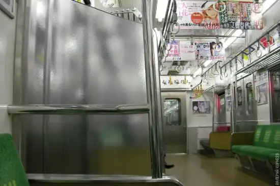 На загруженной кольцевой Яманотэ часть вагонов с увеличенным числом дверей и только откидными сиденьями.