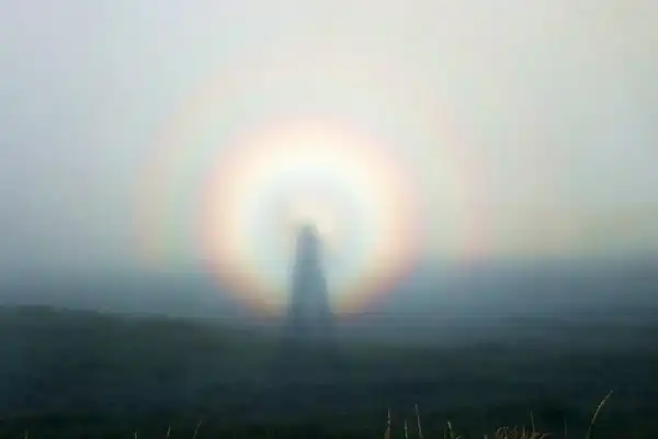 Глория. Чтобы увидеть этот эффект, надо ночью в горах разжечь костер, выбрав погоду с низкими облаками. Тогда вокруг головы появится ореол, а на облаках - Ваша тень. Такое-то явление и называется глорией. По сути это оптическое явление, наблюдаемое на облаках, которые расположены ниже наблюдателя или прямо перед ним в точке, прямо противоположной источнику освещения. На Востоке даже принято называть глорию "светом Будды". Тень наблюдателя всегда окружена цветным гало, неслучайно это толковалось как степень его просветления или же близости к божествам, в частности - Будде.