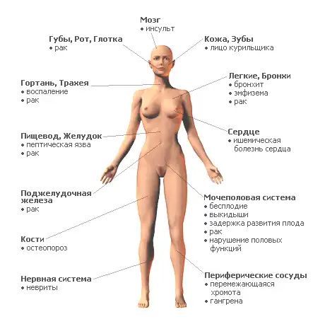 Алкалоид листьев табака, никотин поступает в организм курильщика через лёгкие. Всасываясь в лёгочных капиллярах он поступает в кровоток и разносится по всему организму. В центральной нервной системе, в вегетативных нервных узлах, в нервно-мышечных соединениях существуют рецепторы, чувствительные к никотину (ацетилхолинергические рецепторы). Стимуляция этих рецепторов вызывает изменения в работе всех систем организма. Учащается сердцебиение, повышается артериальное давление, периферические сосуды сужаются, в то время как сосуды головного мозга расширяются, происходит выброс в кровь адреналина, нарастает содержание глюкозы в крови.