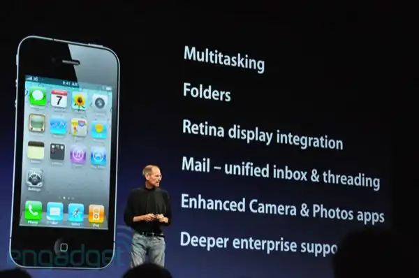Вернувшийся на сцену Стив вылил на голову присутствующих еще один ушат холодной воды — отныне iPhone OS называется iOS и это, оказывается, шестая главная функция нового iPhone 4 (извините, но я сбился со счета). Видимо, для тех, кто не был на предыдущем мероприятии, Джобс решил бегло пробежаться по основным функциям это операционной системы: многозадачности, папкам для приложений, единому почтовому ящику и более глубокой поддержке корпоративного сектора.